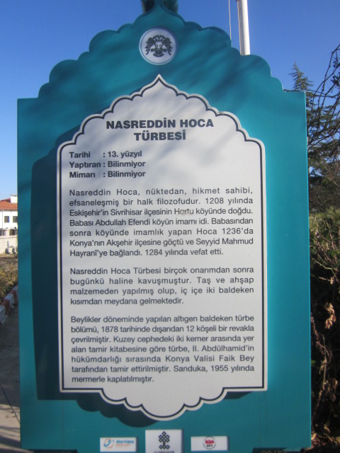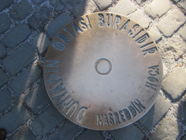 Türbenin hemen önünde bir metal daire şeklinde plaket bulunuyor. Bunun üzerinde bulunduğunuz yerin, dünyanın merkezi olduğu yazılı. 2007 yılında, Nasreddin Hoca Derneği ‘’Dünyanın Ortası Akşehir” şeklindeki tescil belgesini de almış.