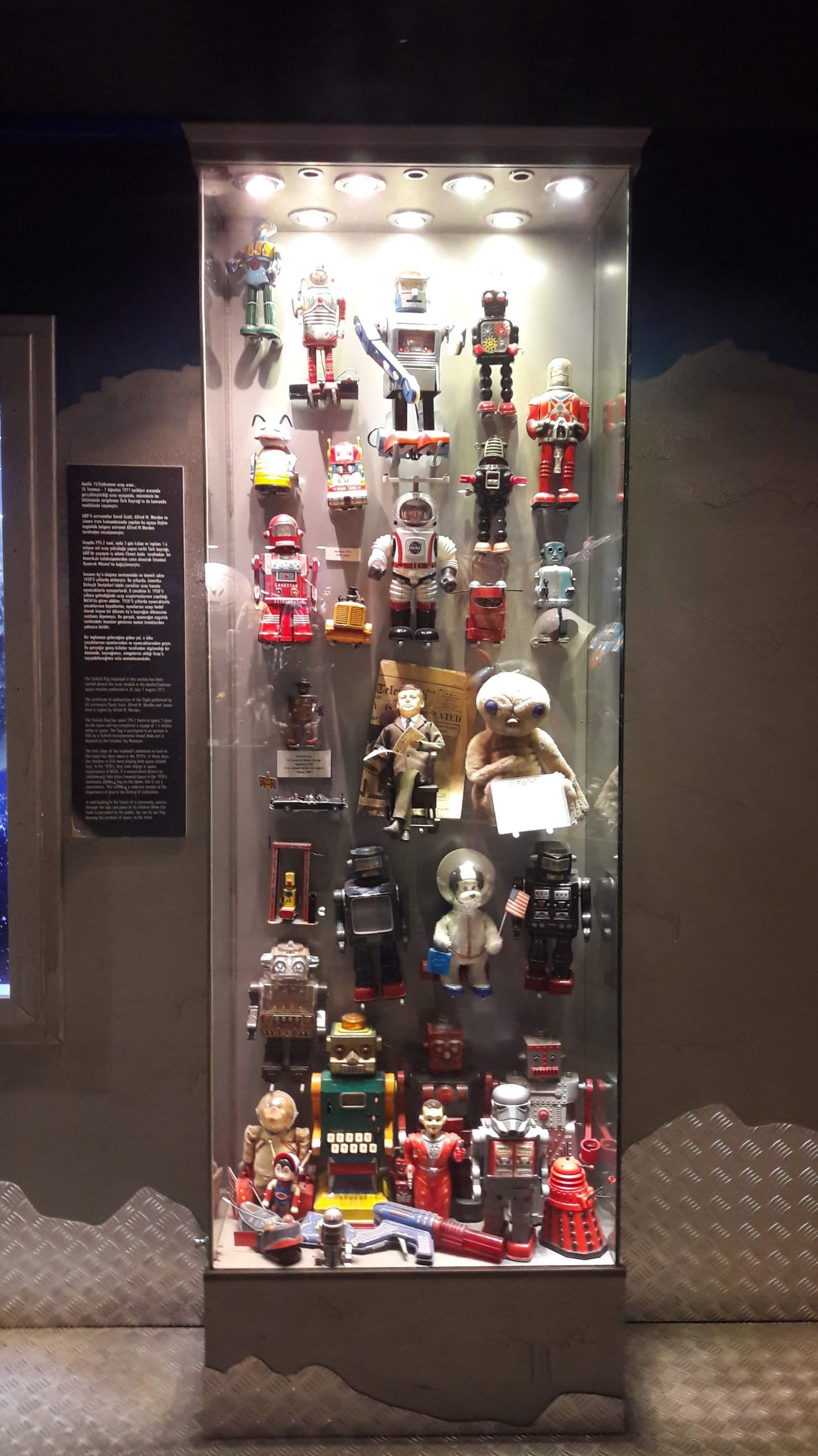 Sunay Akın’ın 20 yılda 40’ı aşkın ülke ziyareti sırasında derleyip toparladığı oyuncaklar, üç katlı köşk içinde ve her bir katı derya deniz şeklinde yerlerini bulmuş. Bak bak bitmiyor. İrili ufaklı o kadar çok oyuncak var ki bir an içimden bir kez gelmek yeterli olmayacak diye geçirdim. Mutlaka atladığımız detaylar olmuştur ki bu da bir sonraki gidişimizin nedeni olacak. Şunu da belirtmeden geçemeyeceğim. Müzeye girer girmez bu oyuncak dünyasının bana hissettirdiği, bir sonraki camekanlı alanda hangi oyuncaklar var, bir sonraki oda da ne var, bir sonraki katta daha ne olabilir ki ? Bunları cevabını odalar ve katlar içinde gezinirken fazlasıyla aldım.