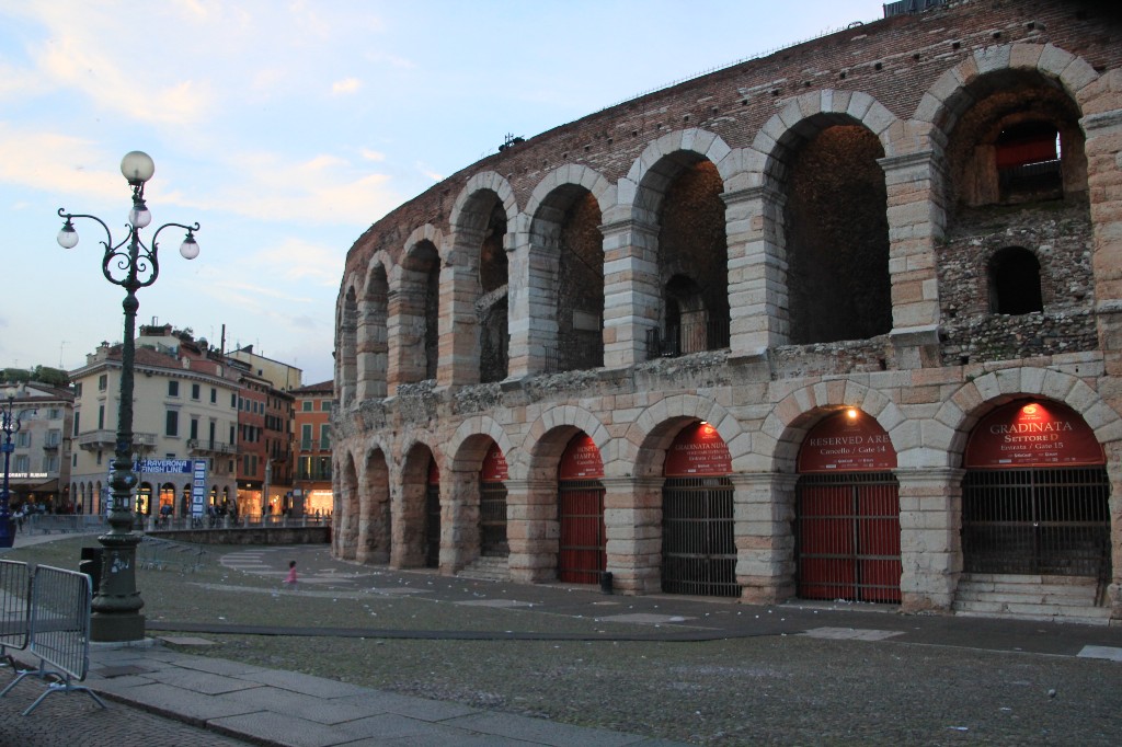 Kahvaltı sonrasında UNESCO Dünya Miras Listesi’ne dahil olan Verona’nın en ünlü ve haraketli meydanlarından biri olan Piazza Bra’daya gittik. Roma’daki ünlü Kolezyum’dan daha küçük, şehrin antik sembollerinin başında yer alan Arena di Verona burada. Kaynaklardan edindiğimiz bilgilere göre Arena MS 1.yy da Roma İmparatorluğu zamanından inşa edilmiş ve 1117 yılında yaşanan depremde zarar görmüş. Ama hala Dünya’nın en önemli müzik festivallerinden birine ev sahipliği yapıyor ve her yıl şahane müzik ziyafetleri verilmesine vesile oluyor.