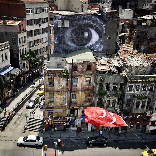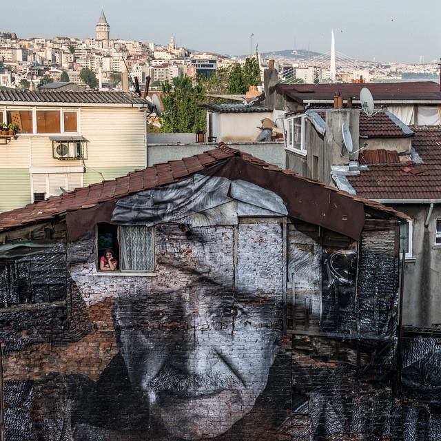 Öncelikle Fransız sokak sanatçısı JR hakkında kısa bir bilgi verelim. Berlin’den Şangay’a kadar çeşitli şehirlerde gerçekleştirdiği Şehrin Kırışıklıkları (Wrinkles of the City)* projesi için 2015 yılında İstanbul’a gelerek projesi kapsamında Tarlabaşı, Galata, Eminönü, Balat ve Mahmutpaşa gibi semtlere gitmiş, yanına gönüllüleri de alarak siyah portre fotoğrafları dev ölçeklerde basmış, bunları derme çatma binaların yan cephelerine, duvarlarına yapıştırarak mekanları ve yüzleri yorgunlukları/eskimişlikleri ile çok net şekilde gözümüzün önünde sergilemiştir.