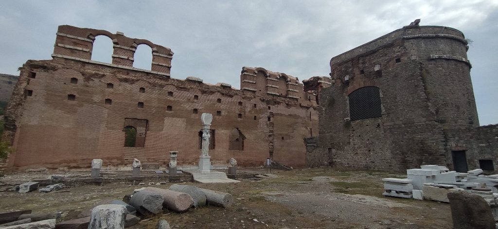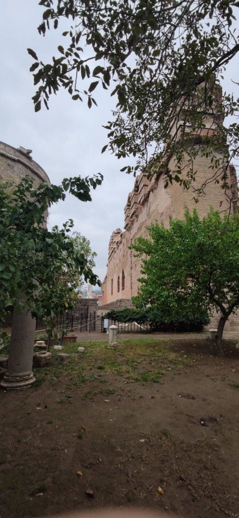Avlunun içinde birden fazla yapı bulunuyor ki bunlardan biri şu an ziyarete açık olan, kubbeli, yuvarlak yapı. Bu yapının tepesi yuvarlak aydınlatma deliğine sahip. 3,70 metre olan delik çapı, Osmanlı döneminde daraltılarak 1 metreye kadar düşürülmüş. Yapının duvarların da Kızıl Avlu’dan çıkarılan heykel parçacıklarına yer verilmiş.