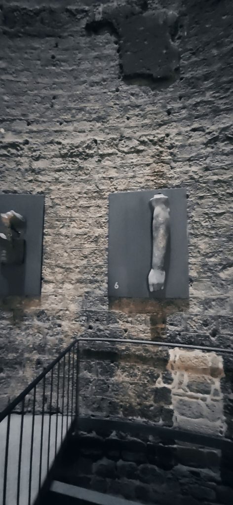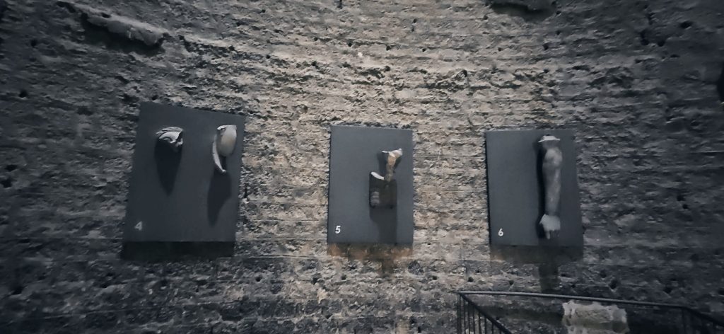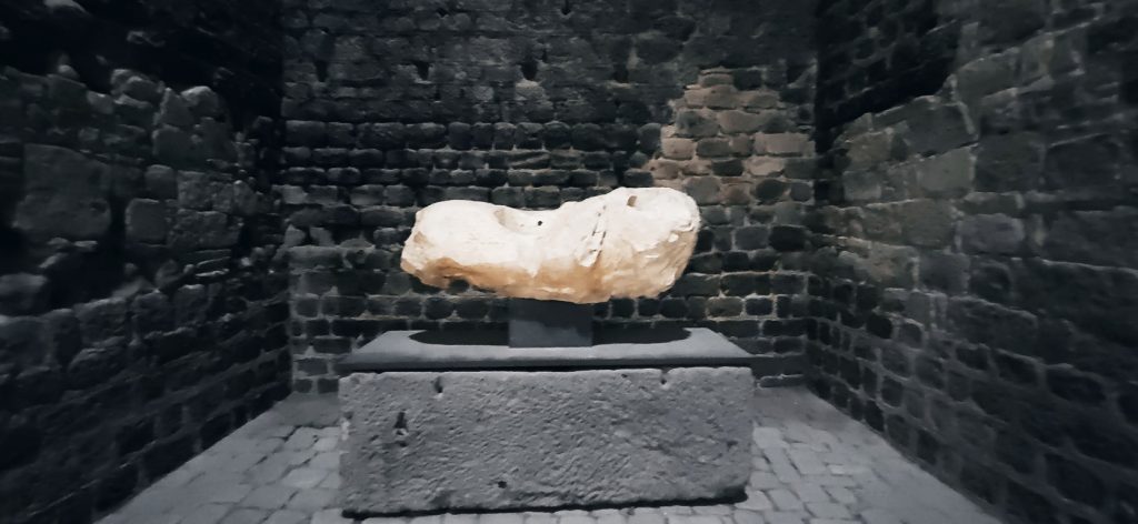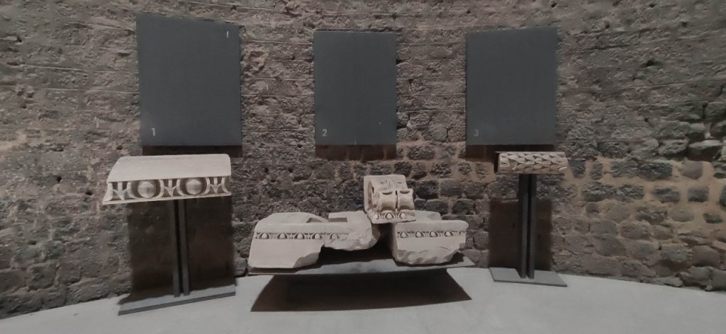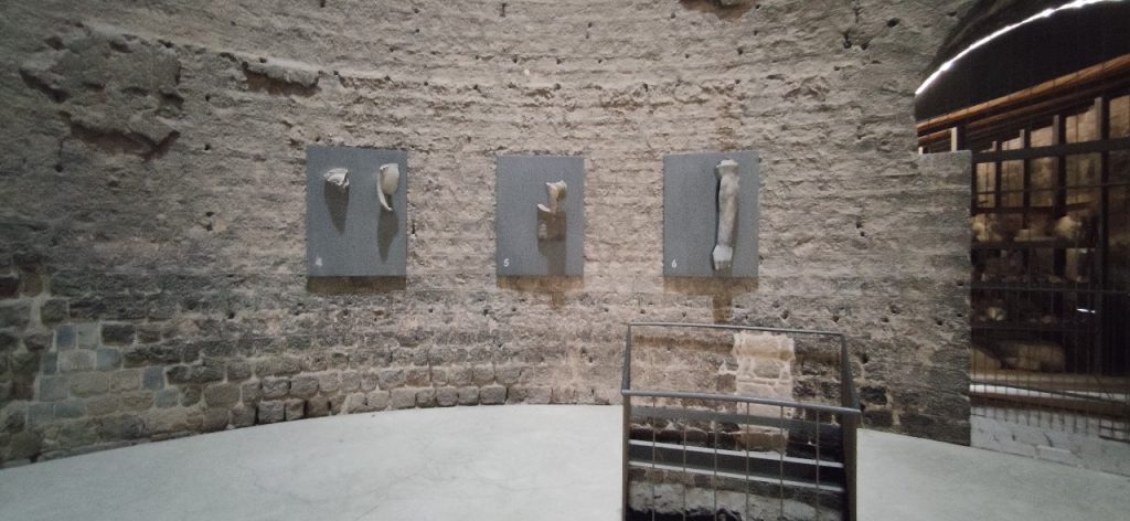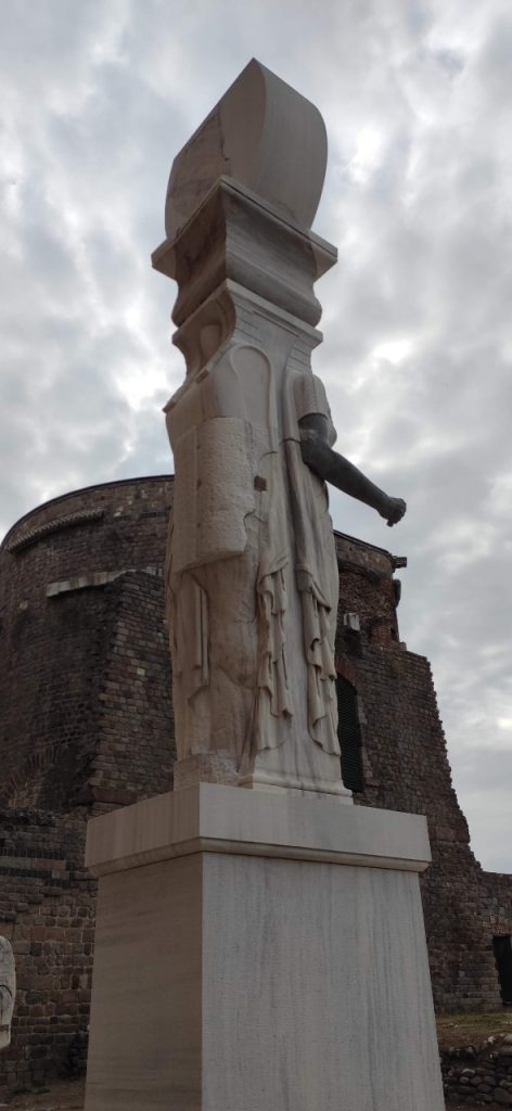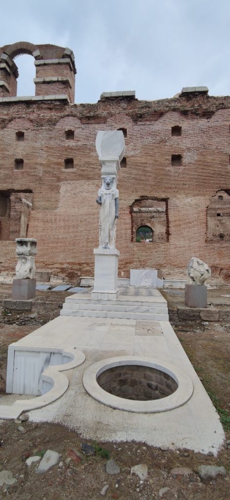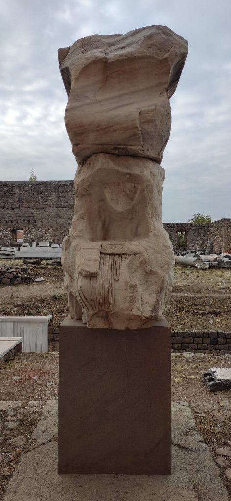 1930’lu yıllarda Alman arkeologlarının yaptığı ve 2002 tarihli kazılarda ilgili alanda çok sayıda heykel parçası bulunmuş ve bunların Mısır etkisinde yapılmış mimari taşıyıcı figürler olduğu tespit edilmiş. Bu taşıyıcıların, sırt sırta vermiş, en az bir insan büyüklüğünde kaideler üzerinde yer alan heykellerden oluştuğu görülmüş. Ele geçirilen heykel parçalarından anlaşıldığına göre, hem insan başlı hem de Mısır tanrılarını oluşturan bazı hayvan başlı figürler bulunmuş. Bugüne kadar tespit edilenler aslan, çakal, timsah ve maymun figürleri… Beyaz mermerden yapılmış figürlerin el, kol, bacak ve ayakları ile yüzleri siyah-gri mermerden yapılmış. Geçmiş dönemde her biri iki ay süren toplam 14 çalışma sezonunda, öncelikle güney kulenin konservasyonu* yapılarak müze işlevi kazandırılmış. Daha sonra anıtsal bir tanrı heykelinin özgün boyutta rekonstrüksiyonu gerçekleştirilmiş ki bu heykeli avlunun içinde görebilirsiniz. Heykel az önce yukarıdan bahsettiğimiz taşıyıcı heykellere de bir örnekte oluşturur. Yaklaşık 8,50 metre yüksekliğindeki sütunlar, Mısır Tanrıçası Sekhmet‘i canlandırıyor. Aşağıdaki fotoğrafta beyaz renkteki parçalar günümüzde, heykel tamamlansın diye hazırlanan parçalardır. Diğer kalan kısımlar gerçek ve yapılan kazılar sonucu ortaya çıkarılmış.